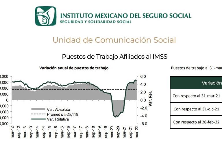 MÉXICO._ Al 31 de marzo de 2022, se tienen registrados ante el Instituto Mexicano del Seguro Social (IMSS) 21 millones 005 mil 852 puestos de trabajo puestos de trabajo; de éstos, el 86.6 por ciento son permanentes y el 13.4 por ciento son eventuales. La relación de puestos permanentes respecto del total es la más alta de los últimos 12 años para un mes de marzo.