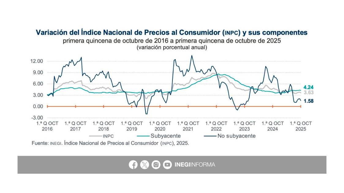 El índice de precios subyacente, que incluye los bienes y servicios cuyos precios son menos volátiles, observó un crecimiento durante la primera mitad del décimo mes de 2025, de 0.18 por ciento y anual de 4.24 por ciento, cifra ligeramente menor al 4.30 por ciento observado en la quincena previa. A su interior, los precios de las mercancías se incrementaron 4.06 por ciento y los de servicios, 4.42 por ciento, ambos respecto al mismo periodo del año anterior.