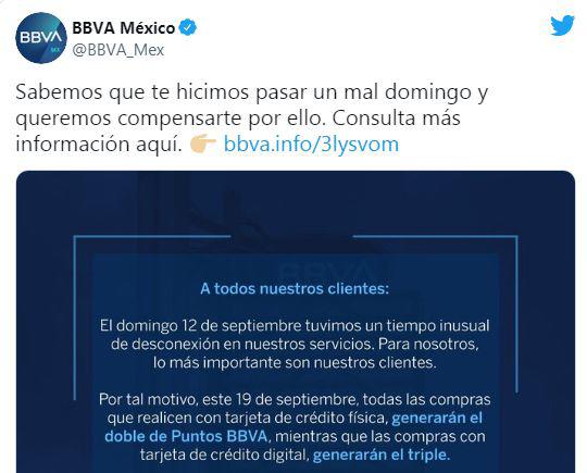 “El domingo 12 de septiembre tuvimos un tiempo inusual de desconexión de nuestros servicios. Por tal motivo, este 19 de septiembre todas las compras que se realicen con tarjeta de crédito física, generarán el doble de puntos BBVA”, dijo el banco en Twitter.