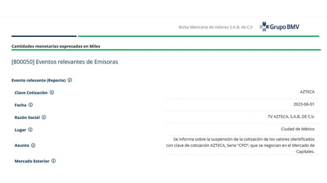 Según indicó en comunicado, con base en la Ley del Mercado de Valores, la BMV “suspende, a partir de hoy, 1 de junio de 2023, la cotización de los valores representativos de capital de la emisora denominada TV Azteca, S.A.B. de C.V., identificados con la clave de cotización AZTECA, Serie CPO”.