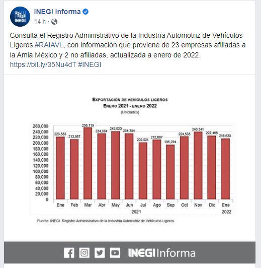 El INEGI da a conocer el Registro Administrativo de la Industria Automotriz de Vehículos Ligeros (RAIAVL), cuya información proviene de 23 empresas afiliadas a la Asociación Mexicana de la Industria Automotriz, A.C. (AMIA), Giant Motors Latinoamérica y Autos Orientales Picacho.