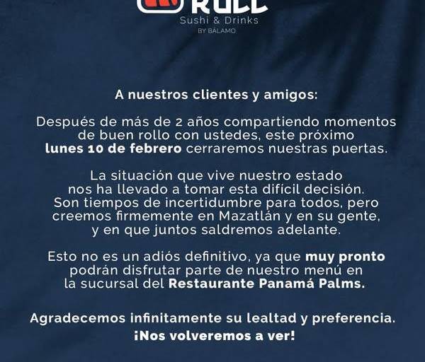 MAZATLÁN._ Después de una complicada temporada por la cual ha atravesado el sector económico del puerto a causa de la inseguridad, el restaurante Playa Roll Sushi & Drinks cerró sus puertas en Mazatlán el pasado 10 de febrero.