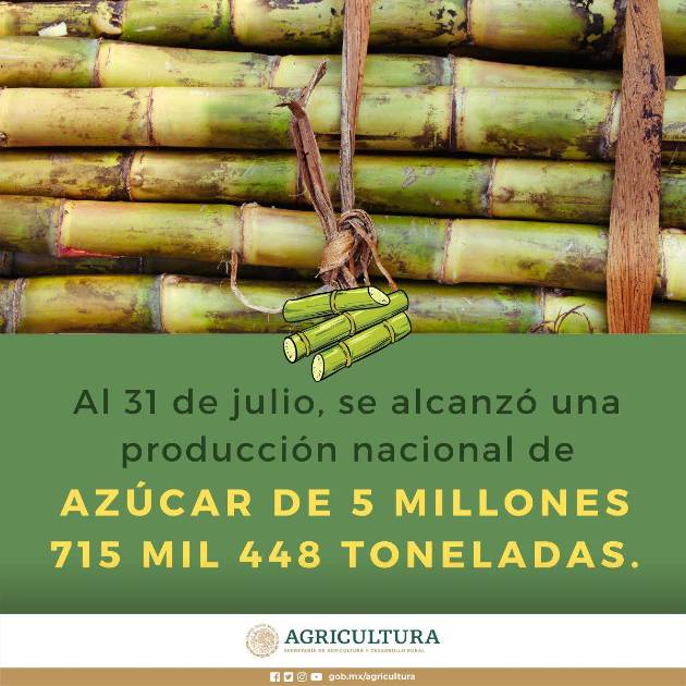 La Secretaría de Agricultura y Desarrollo Rural informó que en la semana 44 del ciclo azucarero con fecha de corte al 31 de julio se alcanzó una producción nacional de cinco millones 715 mil 448 toneladas de azúcar, lo que representa un aumento de 8.28 por ciento, con relación a la zafra 2019/2020, que registró cinco millones 278 mil 320 toneladas.