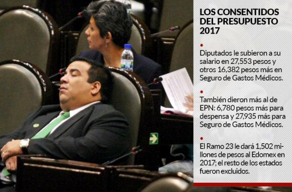 A los diputados no les gustó la remuneración que la Secretaría de Hacienda y Crédito Público propuso para ellos en el paquete 2017. Así, sus sueldos tendrán un aumento de 27 mil 553 pesos. Con esto, los legisladores pasarán de una percepción salarial de 1 millón 432 mil 997 pesos a 1 millón 460 mil 550 pesos.