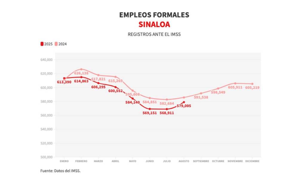Al cierre de agosto de 2024, unos días antes de que se desatara la disputa entre las facciones Guzmán y Zambada en Culiacán, Sinaloa registraba 585 mil 679 empleos formales ante el Instituto Mexicano del Seguro Social (IMSS); un año después, al cierre de agosto de 2025, el estado registró 579 mil 005 empleos, para una pérdida de 6 mil 674 puestos de trabajo, que equivalen a una caída de 1.1 por ciento.