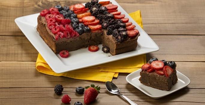 El brownie se puede servir solo o acompañado de una bola de helado de vainilla, nata montada o salsa de chocolate. Córtalo en cuadritos y decóralo con los frutos rojos y las hojas de menta.