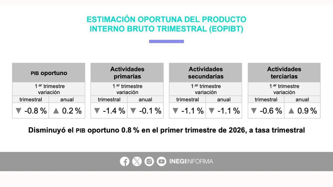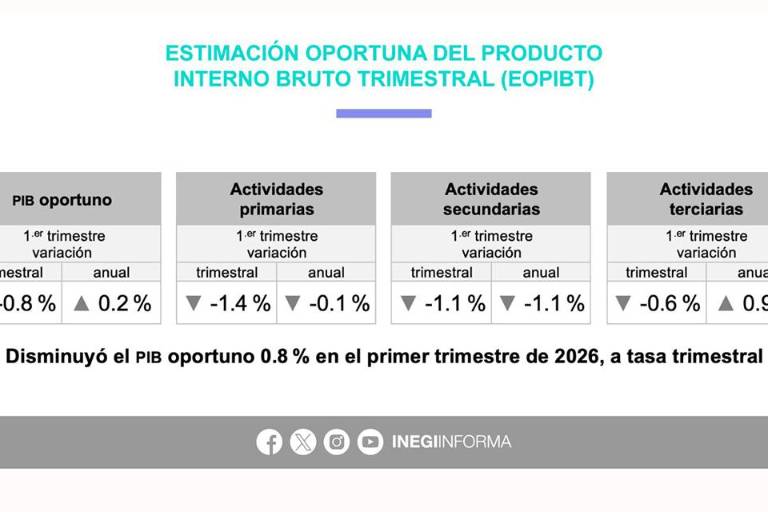 A tasa interanual, el PIB avanzó apenas 0.1 por ciento en cifras originales durante el periodo enero-marzo de 2026, resultado que también quedó por debajo de la expectativa de los analistas, quienes proyectaban una tasa anual de 0.8 por ciento.