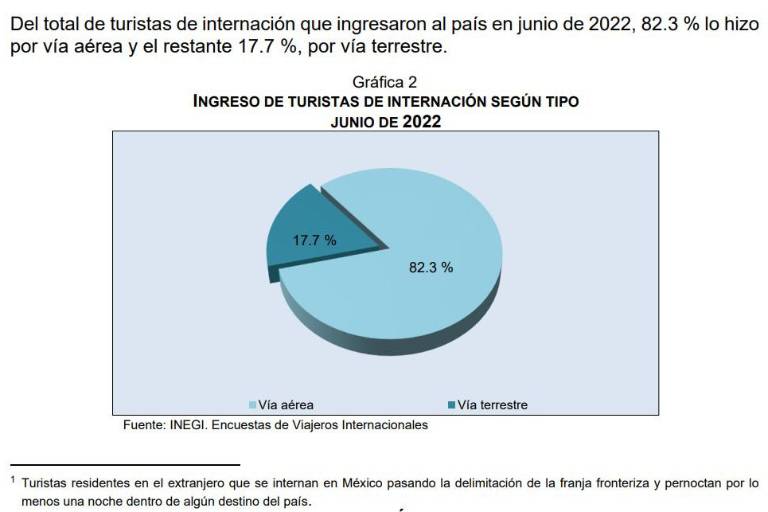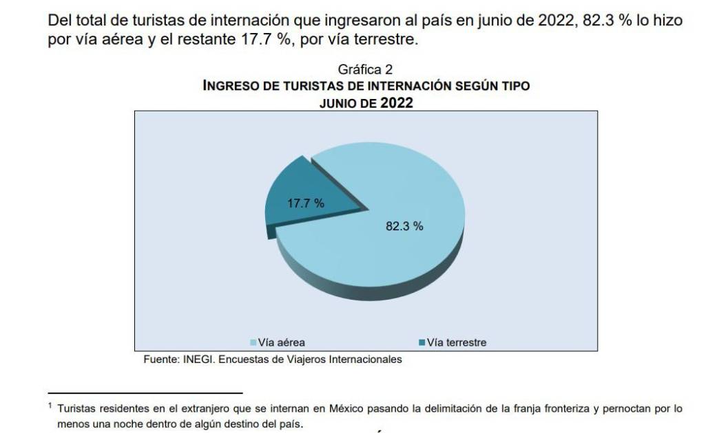 El Inegi detalló que del total de turistas de internación que ingresaron al país en junio de 2022, el 82.3 por ciento lo hizo por vía aérea y el restante (17.7 por ciento), por vía terrestre.