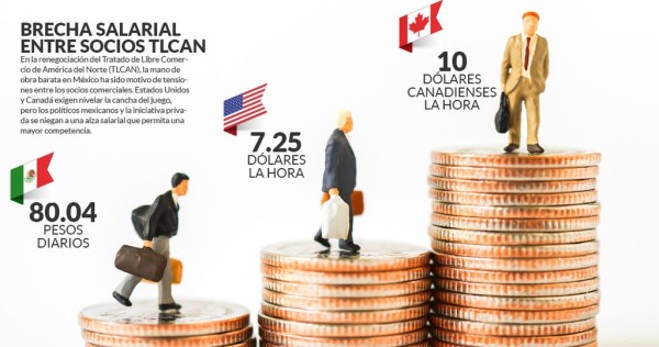 Los bajos salarios en este país son la mayor ventaja comparativa y atracción para las empresas al representar menores costos. De acuerdo con la Organización para la Cooperación y el Desarrollo Económicos (OCDE), el salario mínimo en México es de mil 911 dólares al año frente a los 15 mil 062 dólares en Estados Unidos y 16 mil 995 dólares en Canadá. Esto no representa una cancha pareja entre los socios comerciales.