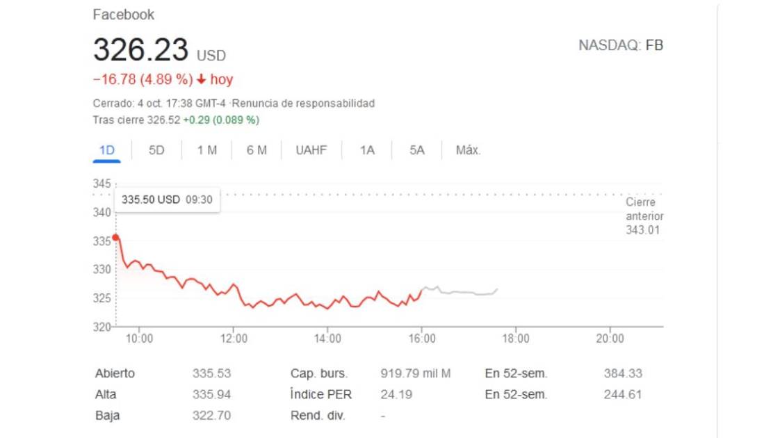 El valor de las acciones de Facebook durante este lunes iniciaron en 335.53 dólares por documento y llegó a cotizarse en 322.70 dólares, aunque terminó cerrando en 326.23 dólares.