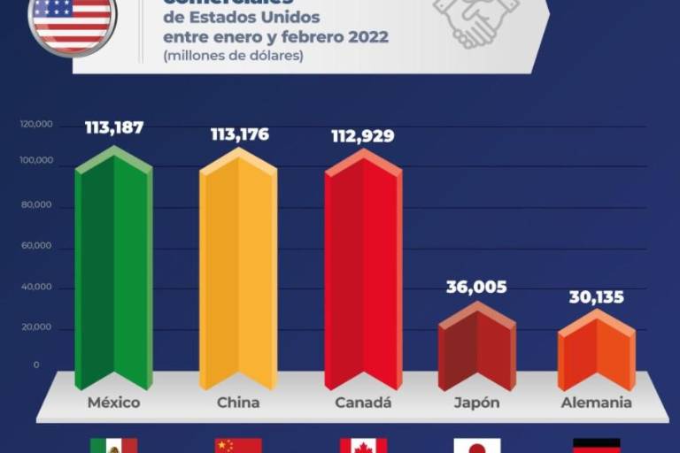 Por su parte, la Secretaría de Economía, Tatiana Clouthier, confirmó que el territorio mexicano se ubicó en el primer lugar de los principales países con los que comercia Estados Unidos en lo que va de 2022.China fue registrado como el segundo socio comercial de Estados Unidos durante febrero y generó un comercio total de 113 mil 175 millones de dólares.