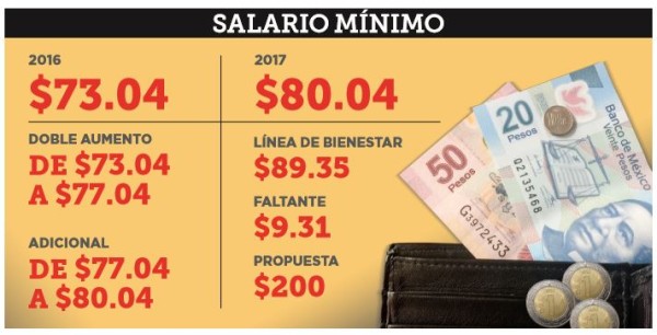 La Comisión Nacional de los Salarios Mínimos publicó en su cuenta de Twitter: “El monto del salario mínimo general a partir del 1 de enero de 2017 será de $80.04 pesos diarios”.