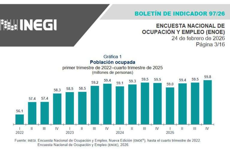 En el trimestre octubre-diciembre de 2025, la población ocupada totalizó 59.8 millones de personas —24.5 millones de mujeres y 35.3 millones de hombres—, lo que representó un alza de 298 mil personas frente al cuarto trimestre de 2024.