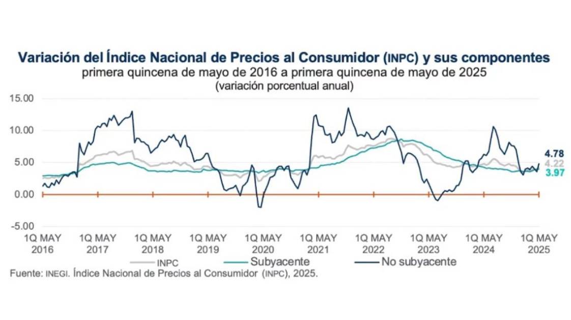 El índice de precios subyacente, que incluye los bienes y servicios cuyos precios son menos volátiles, observó un crecimiento en la primera mitad del quinto mes de 2025,, de 0.16 por ciento y anual de 3.97 por ciento, cifra mayor al 3.96 por ciento, observado en la quincena previa. A su interior, los precios de las mercancías se incrementaron 3.51 por ciento y los de servicios, 4.49 por ciento, ambos respecto al mismo periodo del año anterior.