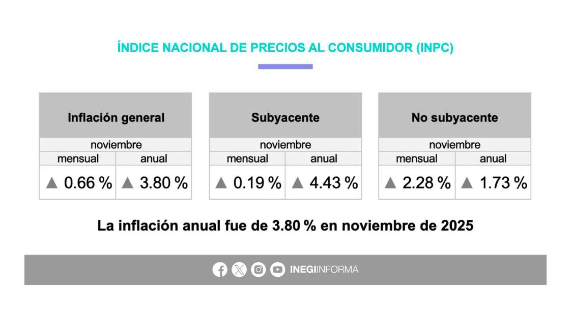 Inflación supera expectativas en noviembre y repunta a 3.8% anual
