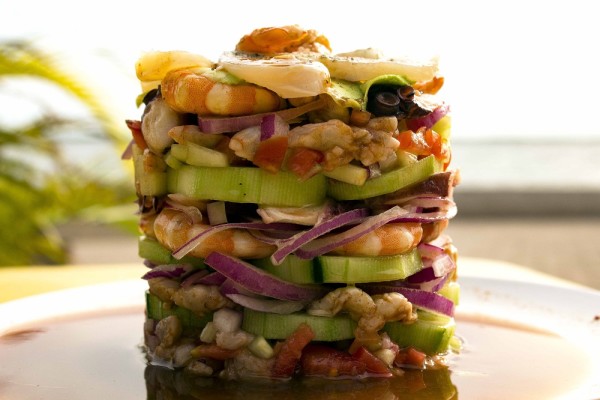 Muy al ratito, Érika me presentó a su compañero de vida, Miguel Harraca, un sobrio argentino que recorre el mundo dando asesorías en cuestiones de turismo, y supe de inmediato que con ellos podría pasar una velada inolvidable -al calor de cualquier atardecer anaranjado de Altata-, frente a una botella de algo y donde con seguridad aflorarían temas de gran interés. En esas estábamos cuando de repente me trajeron su celebrada Torre 33, el estilo de emplatado de mariscos que se ha vuelto tendencia gastronómica en los últimos tiempos, primero en Culiacán y luego allende sus fronteras, esta vez compuesto por cinco pisos, que dan principio con una cama de ceviche y continúan con capas de camarones, pulpo, julianas de cebolla morada, cortes de pepino y cubos de tomate, hasta concluir con un topping de callos de hacha, coquetamente arreglados en flor. Espectacular.