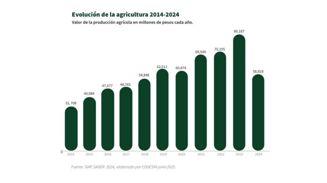 El valor de la producción agrícola en Sinaloa durante el año 2024 cayó a su nivel más bajo en al menos cinco años, al cerrar en 58 mil 818 millones de pesos, según el reporte elaborado por el Consejo para el Desarrollo Económico de Sinaloa, con datos del Sistema de Información Agroalimentaria y Pesquera y de la Secretaría de Agricultura y Desarrollo Rural.
