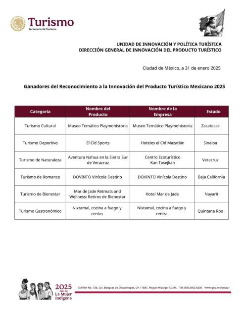 Este premio oficial se entrega, previo a una selección de empresas participantes de diversos estados de la República Mexicana, mediante convocatoria emitida en diciembre del 2024 por la Secretaría de Turismo del Gobierno de México para que participaran por el Reconocimiento a la Innovación del Producto Turístico Mexicano 2025, con la finalidad de continuar reconociendo las iniciativas que han contribuido a la innovación del producto turístico nacional de las empresas turísticas en los destinos turísticos del país, señala en su justificación.