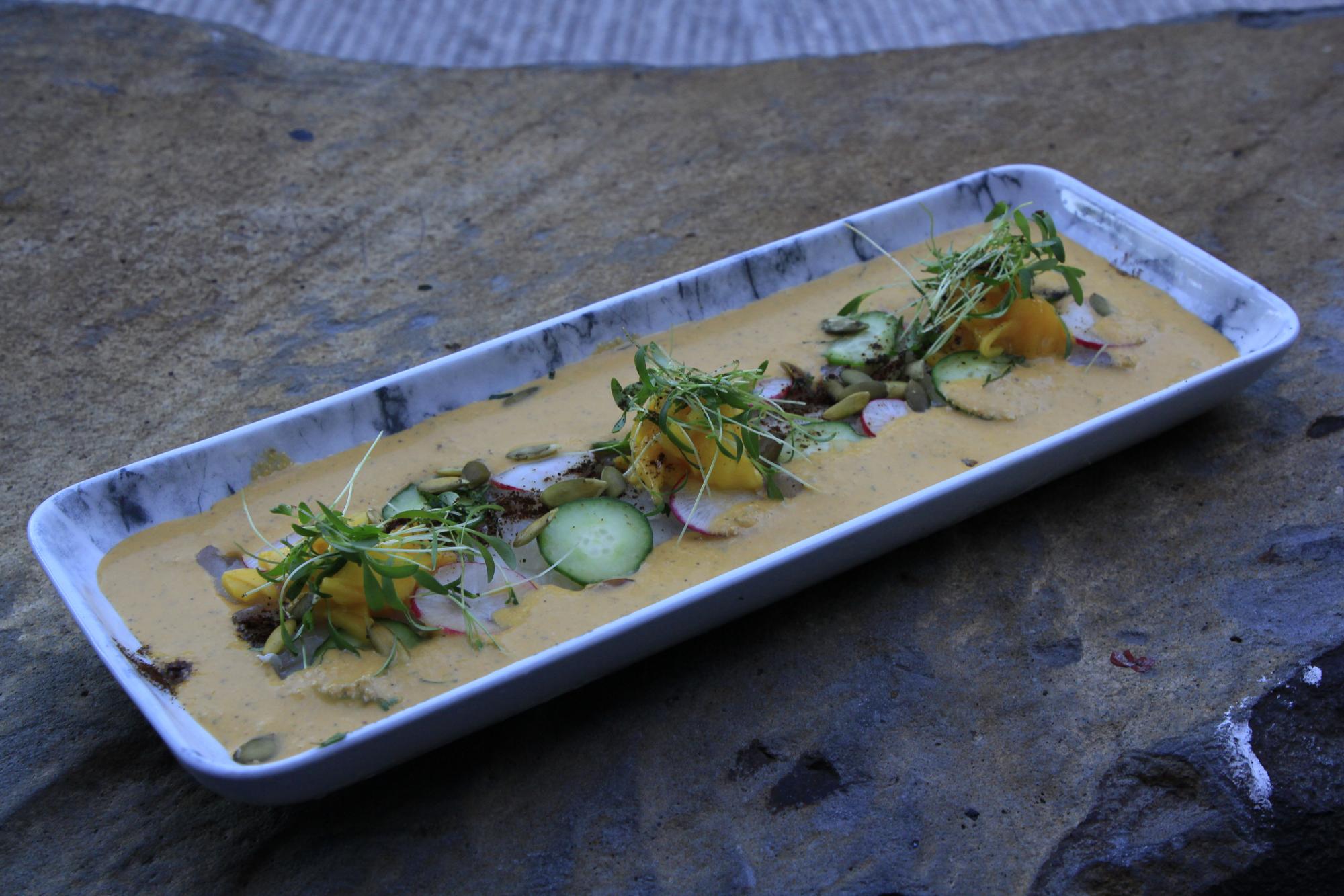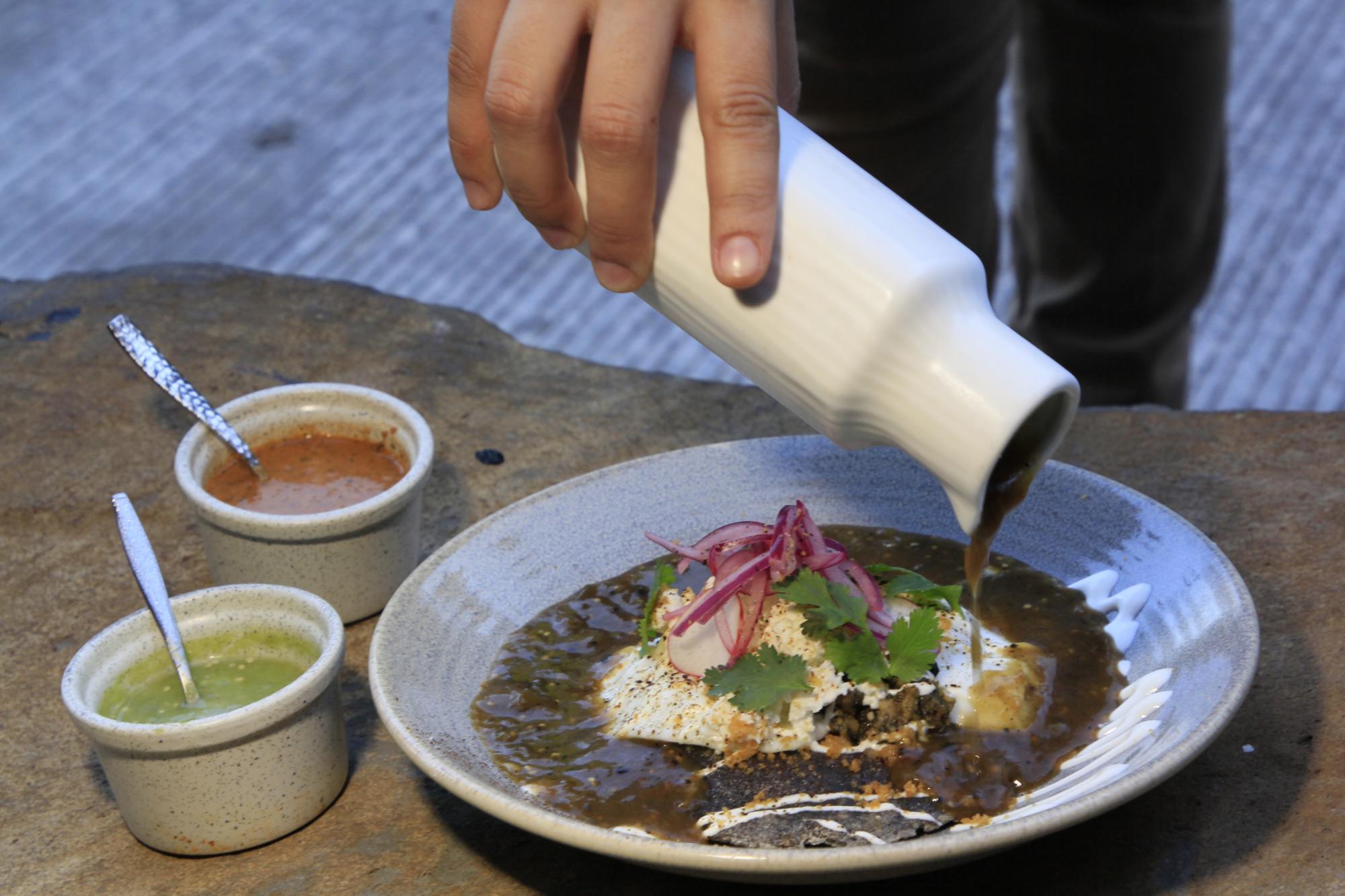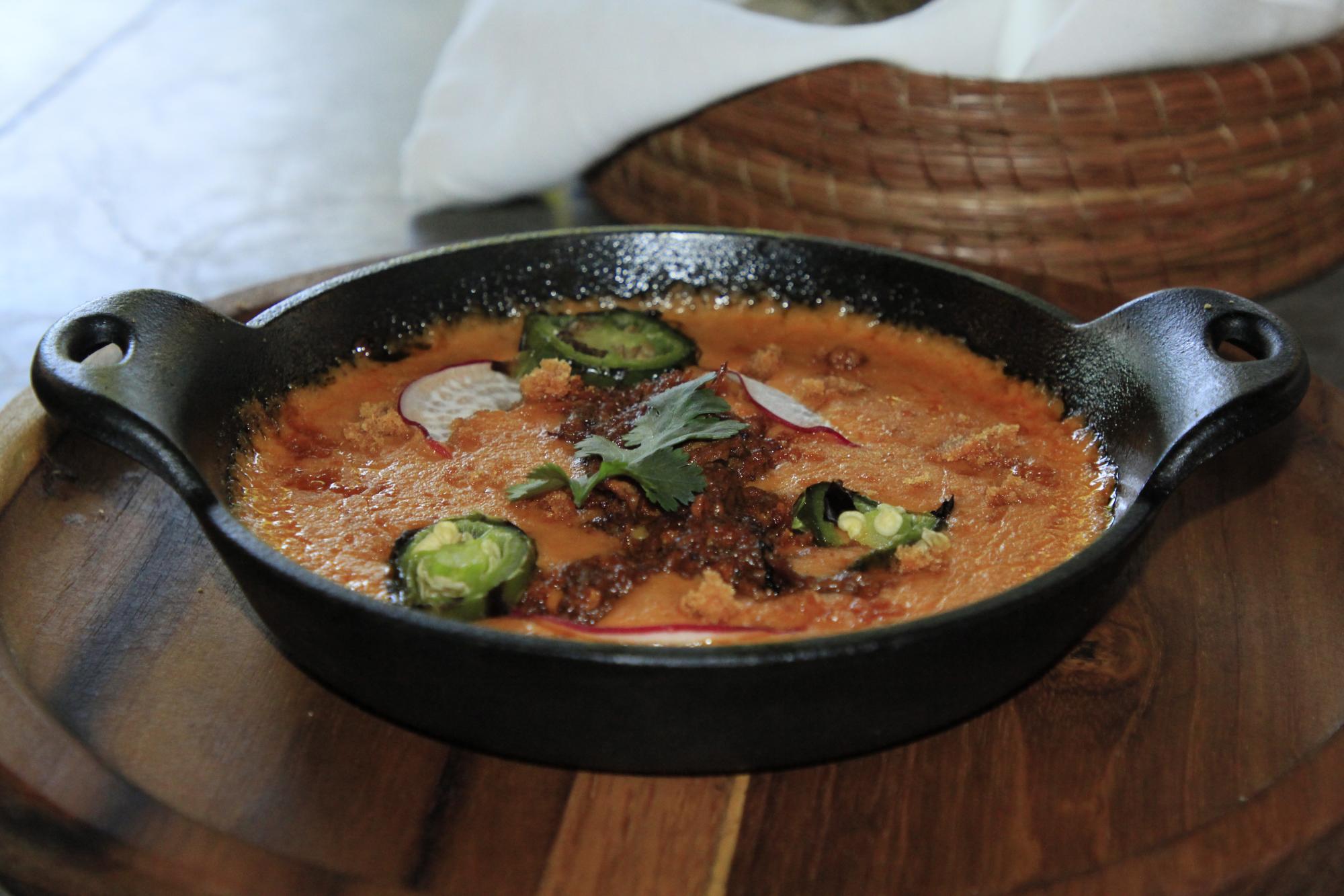 El recorrido de sabores de la nueva propuesta gastronómica de Humaya también integra un caldo de camarón sazonado con una mezcla de chiles, un croissant relleno de carne de borrego, y un postre cuyo protagonista son los frutos silvestres montados en un turrón y coronados con nieve.