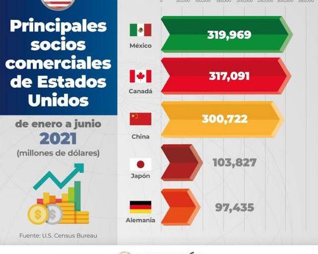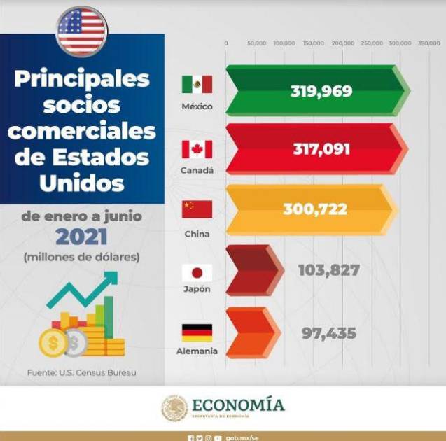 MÉXICO._ La Secretaría de Economía resaltó que México se consolidó como el primer socio comercial de Estados Unidos en el primer semetre de 2021, con un intercambio que alcanzó casi 320 mil millones de dólares.