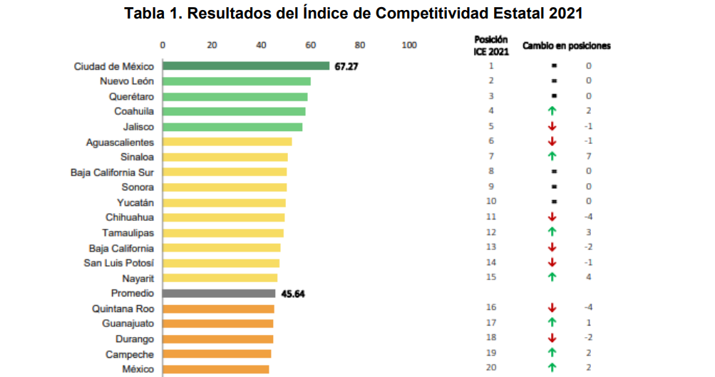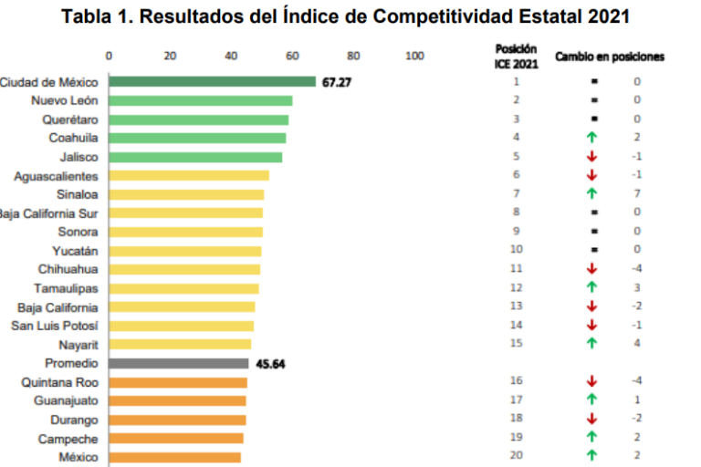 La entidad sube siete lugares en el Índice de Competitividad Estatal 2021, que evalúa aspectos como el económico, el de Estado de Derecho, el de la inclusión y el de la innovación