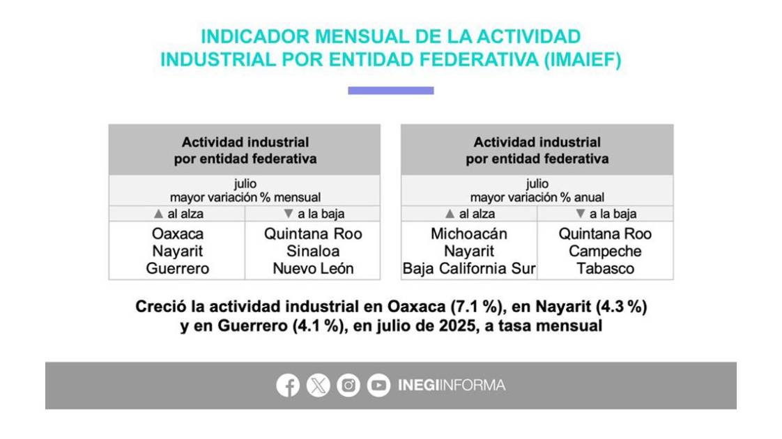 Al contrario, en julio de 2025 y con cifras desestacionalizadas, la actividad industrial registró los mayores incrementos en Oaxaca, Nayarit, Guerrero, Durango, Tlaxcala, Colima y Zacatecas, respecto al mes previo, en términos reales.