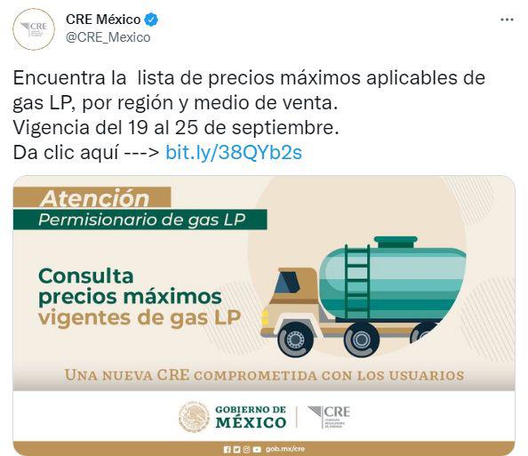Ciudad de México, 18 de septiembre (SinEmbargo).– La Comisión Reguladora de Energía (CRE) publicó este sábado los precios máximos de venta de gas LP que estarán vigentes en la semana del 19 al 25 de septiembre. El costo promedio nacional será de 24.50 pesos por kilogramo, es decir, tendrá un aumento de 54 centavos respecto a la semana que cierra hoy.