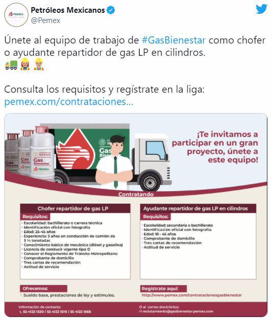 De acuerdo con el Presidente Andrés Manuel López Obrador, Gas Bienestar empezará a operar dentro de dos meses, por lo cual Pemex emitió una convocatoria para reclutar a personas que distribuyan el energético.