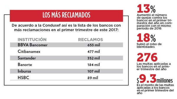 Según la Condusef, las quejas registradas contra los bancos en el primer trimestre del año representan un incremento de 13 por ciento en comparación con el mismo periodo de 2016.