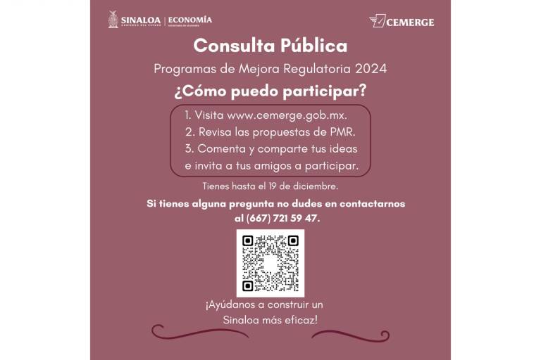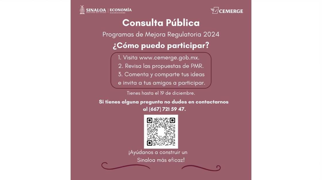 Con el fin de mejorar el funcionamiento y servicios para la ciudadanía y los sectores productivos, la Comisión Estatal de Mejora Regulatoria y Gestión Empresarial, te invita a participar en las Consultas Públicas, donde podrás aportar tu opinión acerca de los Programas de Mejora Regulatoria 2024 realizados por la Administración Pública Estatal, que inició el 7 de noviembre y concluye el 19 de diciembre; por su parte, la de Agendas Regulatorias inició el 14 de noviembre y concluirá el 12 de diciembre, por lo que aún tienes tiempo de participar. Tu contribución ayudará a que los trámites sean más fáciles y rápidos de realizar.