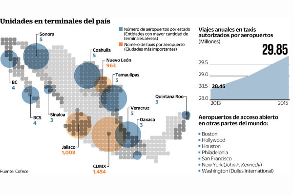 “Los taxis son el principal medio de transportación terrestre desde y hacia los aeropuertos nacionales y su costo puede representar una parte importante de lo que un pasajero desembolsa para hacer un viaje. En 2015, este tipo de transporte atendió a 29 millones 851 mil viajes, de acuerdo a la Estadística Base de Autotransporte Federal de la SCT”.
