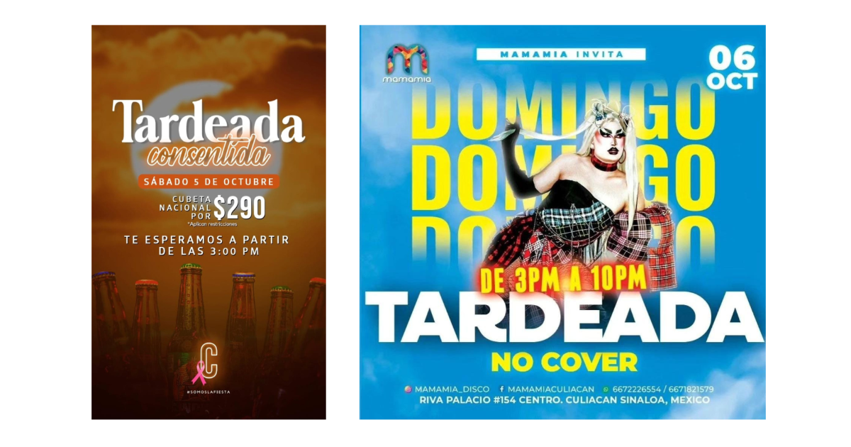 En algunos locales en Culiacán se ha optado por introducir un horario de ‘tardeada’ en los servicios que se ofrecen en los centros nocturnos. Las ‘tardeadas’ comprenden un horario de arranque de servicio desde las 14:00 horas en algunas ocasiones, para culminar la jornada a las 22:00 horas.
