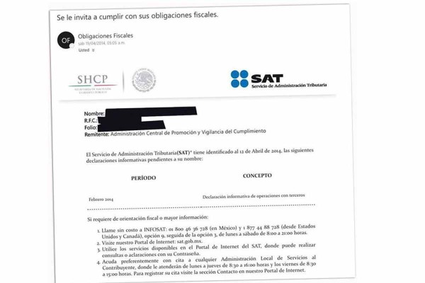 “No entiendo nada de declaraciones”, confesó. “Les debo como 2 mil pesos y no se los pienso pagar. Ya hasta me mandaron citatorio a mi casa. Dejé de declarar después de que terminé los trabajos del año pasado y todas las semanas me llegan sus correos, esos, los de ‘Se le invita a cumplir con sus obligaciones fiscales’”. El SAT le está requiriendo las declaraciones mensuales que le faltan y la declaración anual porque quedaron volando sus ingresos del año pasado.