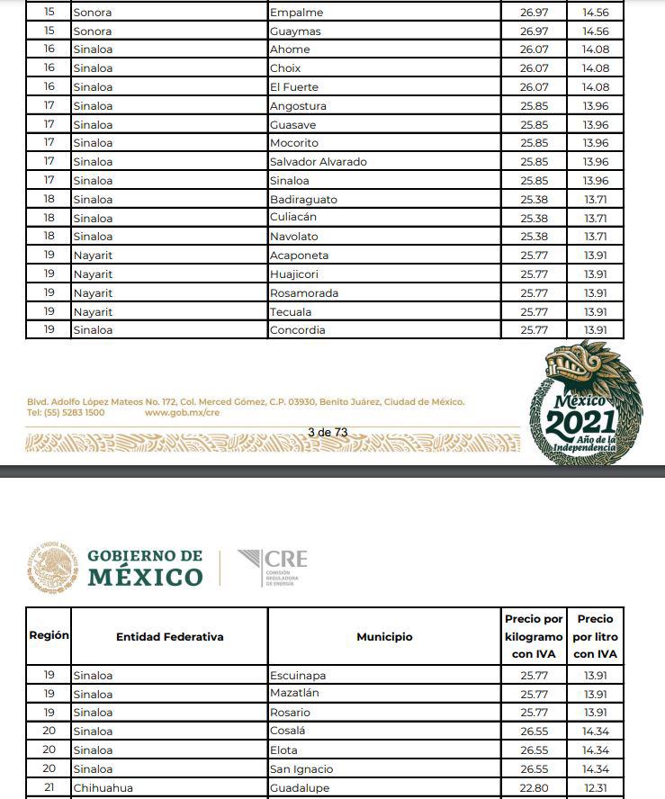 La Comisión Reguladora de Energía (CRE) también publicó los precios máximos de venta para las alcaldías de la Ciudad de México y los municipios mexiquenses de Ecatepec de Morelos, Chimalhuacán, Chalco, Ixtapaluca y Nezahualcóyotl, donde el precio será de 23.74 pesos el kilo y 12.82 pesos el litro. (Con información de Sinembargo)
