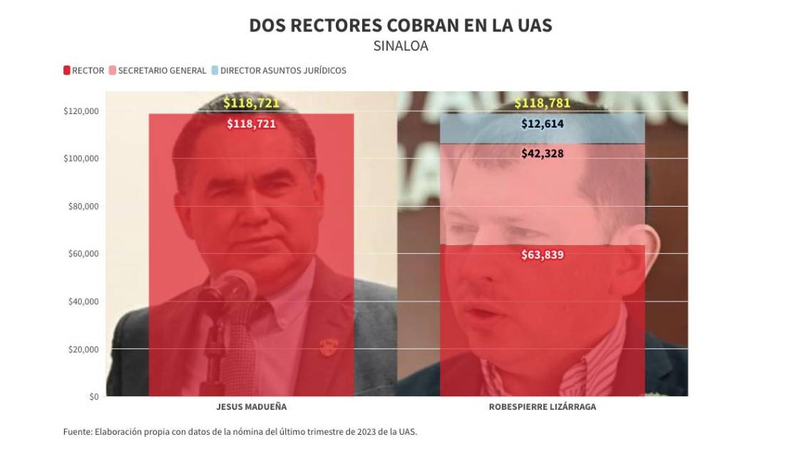 Durante el último trimestre de 2023, Madueña Molina percibió 118 mil 721 pesos mensuales brutos como “Rector”, el máximo cargo del área de adscripción denominada “Rectoría” de la UAS; de acuerdo con la nómina de la Universidad obtenida por Noroeste a través de la Plataforma de Transparencia (PNT). En el portal de Transparencia de la misma UAS, el defenestrado Madueña también figura todavía como Rector.