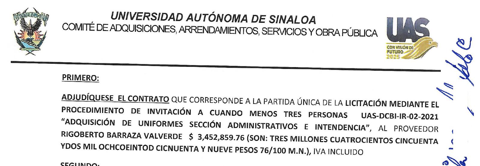 Según consta en el acta firmada por el Comité de Adquisiciones, Rigoberto ganó la licitación a dos proveedores más, Gabriel Azael Torrecillas Rodríguez y Publicidad Creativa del Pacífico S. A. de C. V. por ofrecer el precio “más barato”. La sesión fue presidida por Héctor Melesio Cuén Díaz, director de Control de Bienes e Inventarios de la universidad.