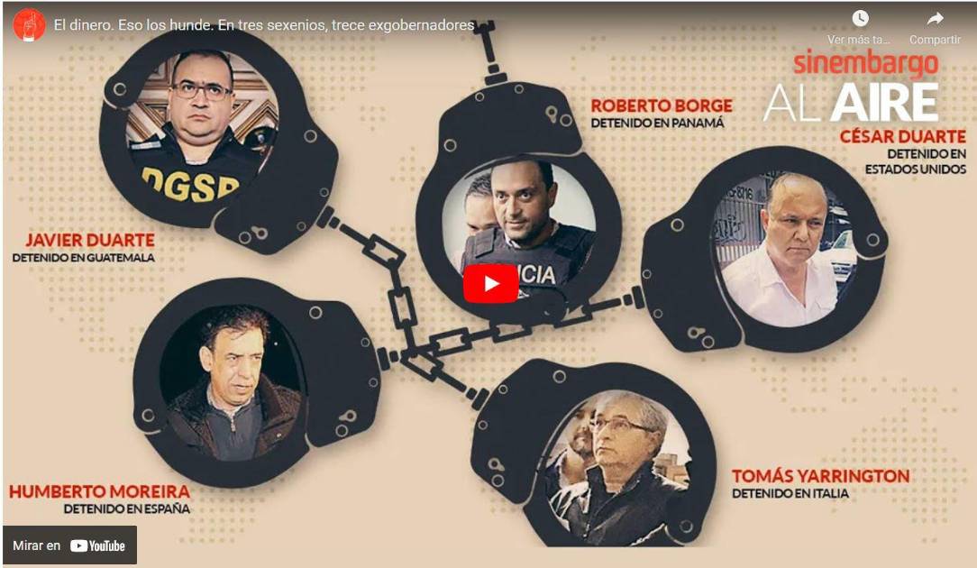 De ellos, cinco fueron aprehendidos en el extranjero. Se trata de los ex mandatarios priistas de Chihuahua, Veracruz, Coahuila, Quintana Roo y Tamaulipas, César Duarte Jáquez, Javier Duarte de Ochoa, Humberto Moreira Valdés, Roberto Borge Angulo y Tomás Yarrington Ruvalcaba.