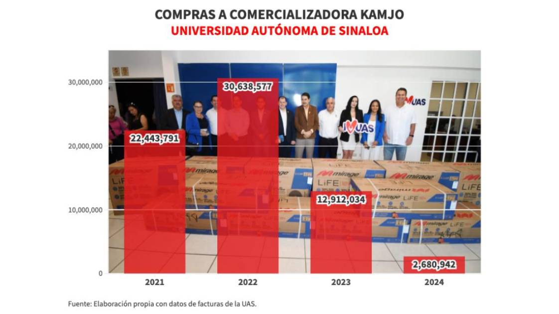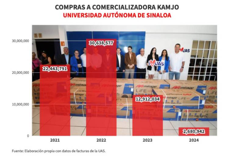 Las ventas de Kamjo a la Universidad comenzaron en 2021, cuando Kamjo le facturó a la UAS 22 millones 443 mil 791 pesos, luego concretó 30 millones 638 mil 577 pesos en 2022; para el año 2023 logró facturarle otros 12 millones 912 mil 034 pesos; y de enero a agosto de 2024 lleva un total de 2 millones 680 mil 942 pesos vendidos a la UAS.