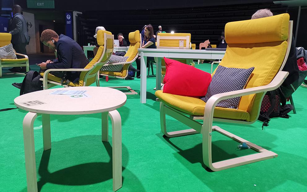 La mayoría de los muebles de la convención fueron cortesía de Ikea, la empresa sueca que ha logrado posicionarse en prácticamente todo el mundo. Sus muebles para armado y de diseños funcionales amueblan millones de hogares. En la COP26 miles de sillas, mesas y sillones ayudaron a recibir a líderes de Estado, diplomáticos, activistas y periodistas.