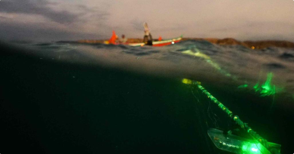 Lanza 10 redes al mar. Cinco de ellas llevan luces led previamente colocadas en la línea superior de la malla. Cada red, de 80 brazadas que equivalen a 133 metros, sujeta 12 bombillas pequeñas, que al tomar contacto con el agua emiten una luz verde. Las redes permanecen toda la noche en la superficie del agua. Durante ese tiempo, las luces sirven de alertas visuales para las tortugas marinas, cetáceos como las marsopas espinosas (Phocoena spinipinnis) o los delfines oscuros (Lagenorhynchus obscurus) y aves como los potoyuncos (Pelecanoides garnotii).