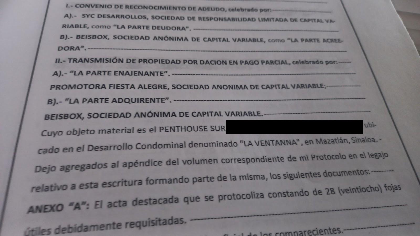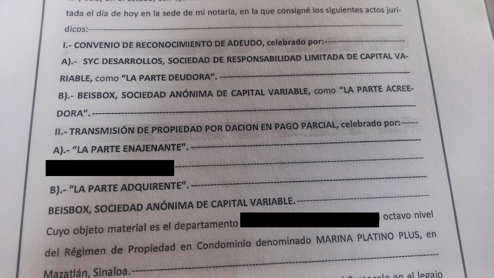 El otro caso, fechado también el 19 de diciembre de 2023, es por la misma situación; según escritura 134 de la misma notaría 296, Beisbox recibió un penthouse en el desarrollo condominal La Ventanna, también en Mazatlán, por 6 millones 671 mil pesos que también se abona para saldar la deuda.