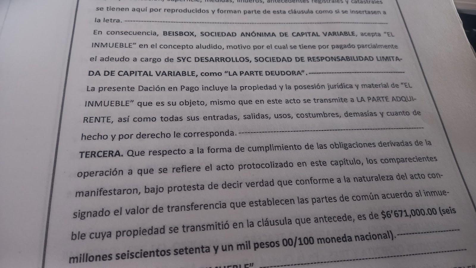 Según el Registro Público de la Propiedad, hay actas de dación por adeudos de otras empresas a favor de Beisbox y de Cuén Díaz, por 14 millones de pesos en tres operaciones distintas: dos en Mazatlán y una en Culiacán.