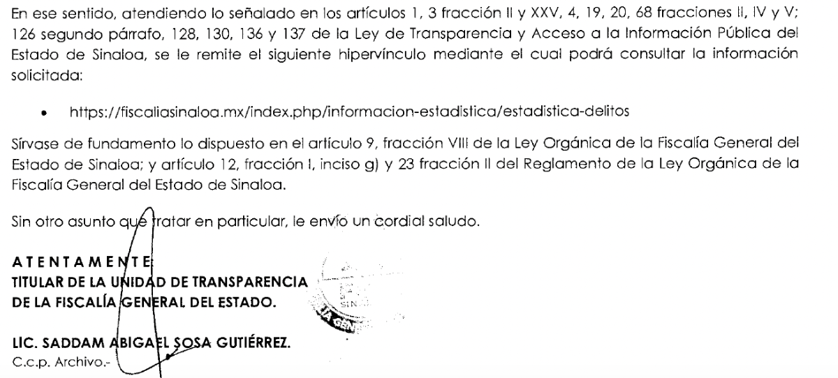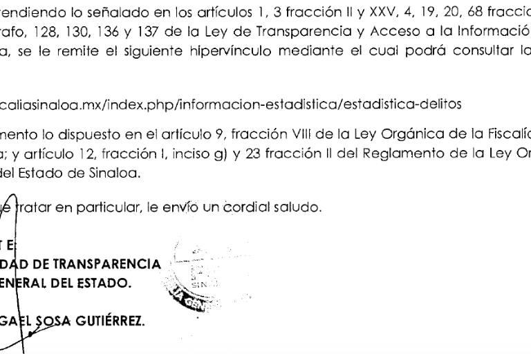 A continuación puede leerse completa la respuesta de la Fiscalía General del Estado a la solicitud más reciente de Noroeste realizada el 25 de junio pasado.