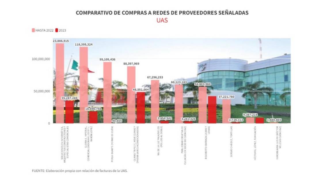 En 2022, el grupo de empresas de Cuadras López le vendió a la UAS 123 millones 886 mil 915 pesos en conceptos de equipo de cómputo, obra y proveeduría de productos varios, pulverizados en 5 mil 643 facturas a las que Noroeste tuvo acceso, y en 2023 realizó ventas por 35 millones 287 mil 269 pesos por los mismos conceptos. La reducción es de 71 por ciento y este caso también ha sido judicializado por las autoridades.