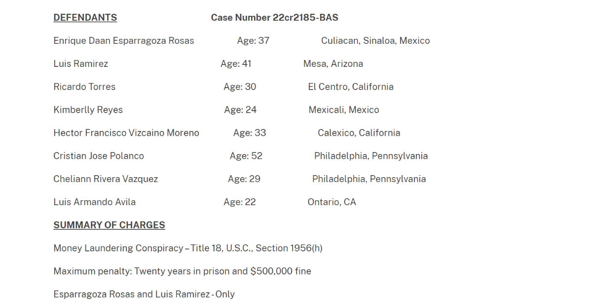 “Según la acusación formal, se inició una investigación en el otoño de 2020, luego de que agentes del FBI identificaran una compleja organización de lavado de dinero presuntamente dirigida por Enrique Daan Esparragoza Rosas, de Culiacán, Sinaloa, México”, indicó la Oficina de Randy S. Grossman, Fiscal del Distrito Sur de California, con sede en San Diego.