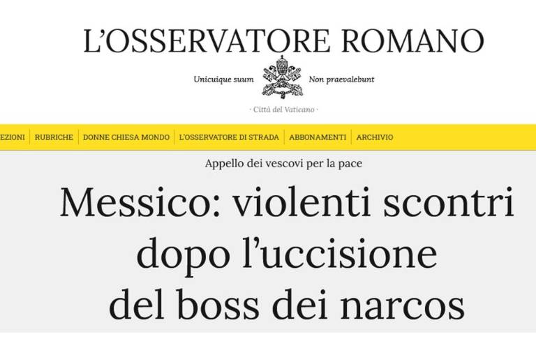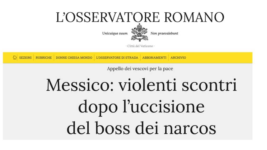 MÉXICO._ El diario L’Osservatore Romano, de El Vaticano, hizo eco en su portal de internet de la jornada de violencia que se ha registrado en México tras la muerte del líder del Cártel de Jalisco Nueva Generación, Nemesio Oseguera Cervantes, “El Mencho”, tras un operativo militar.