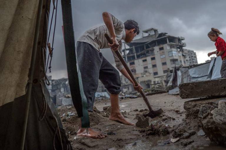 Los edificios, ya azotados por los bombardeos, se están derrumbando bajo el peso de la lluvia y el viento, cobrando más vidas civiles.