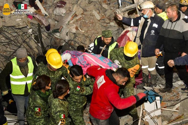 Elementos de la Secretaría de la Defensa Nacional de México rescataron con vida a una persona que se encontraba bajo los escombros de un edificio que colapsó por el sismo de magnitud 7.8 que afectó Turquía y Siria.