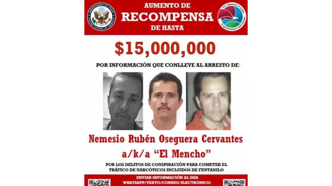 “Hoy, el Departamento de Estado de los Estados Unidos anunció un aumento en la oferta de recompensa bajo el Programa de Recompensas por Narcóticos (NRP, por sus siglas en inglés) de hasta $15 millones por información que conduzca al arresto y/o condena del ciudadano mexicano Nemesio Rubén Oseguera Cervantes, también conocido como ‘El Mencho’”, señaló el Gobierno estadounidense, en un comunicado.