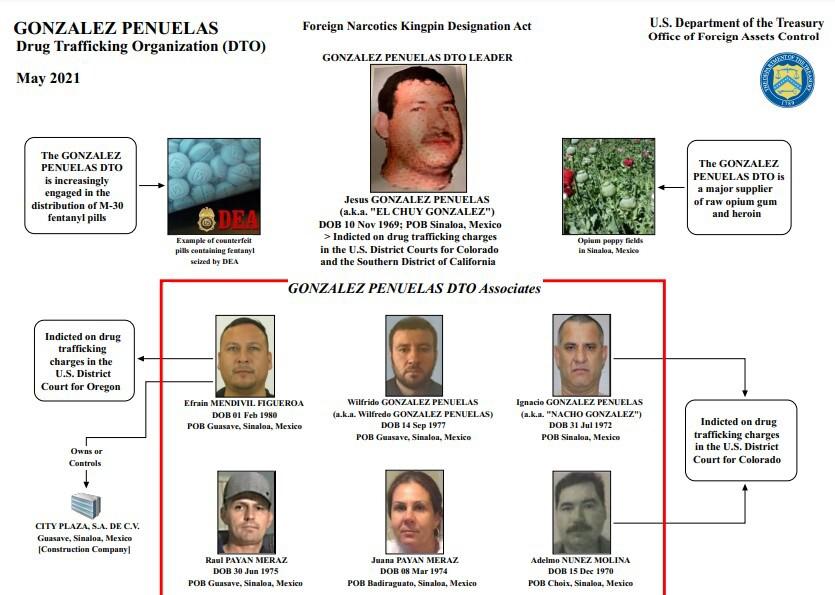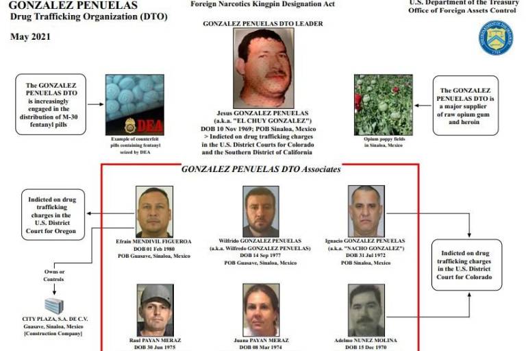 “Jesús González Peñuelas y su organización de tráfico de drogas [que según EE.UU. trabajan con Fausto Isidro Meza Flores y Rafael Caro Quintero] se encuentran entre las mayores fuentes de goma de mascar de opio crudo y heroína en el norte de México, y cada vez más son un importante distribuidor de fentanilo a los mercados estadounidenses”, indicó la OFAC.